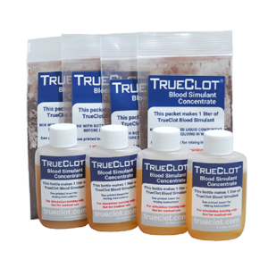 When diluted in water, TrueClot® Blood Simulant Concentrate will create a highly realistic simulated blood for use in traumatic bleeding control, wound packing and advanced hemostatic dressings training. The simulated blood will form realistic simulated blood clots when used with TrueClot® Simulated Hemostatic Gauze or TrueClot® Clotting Solution.