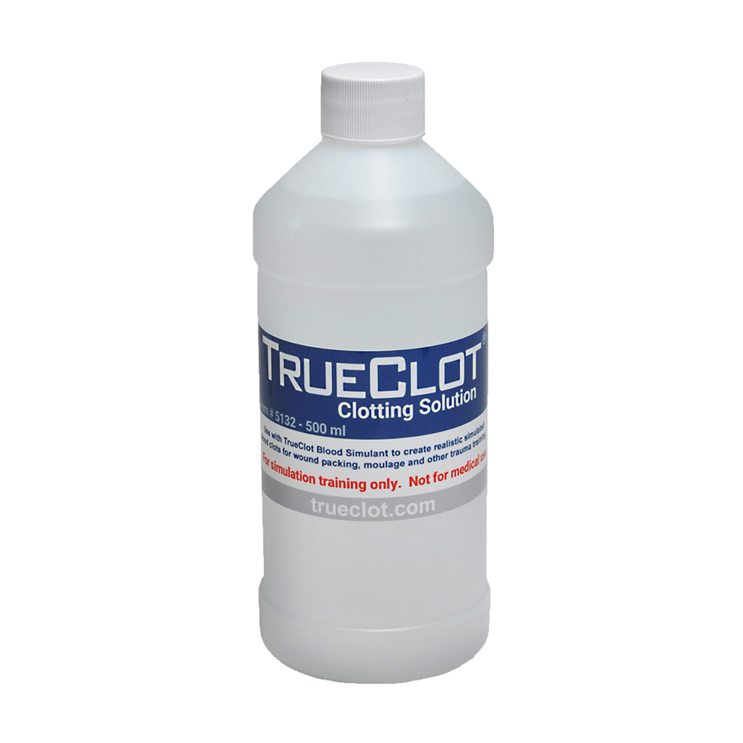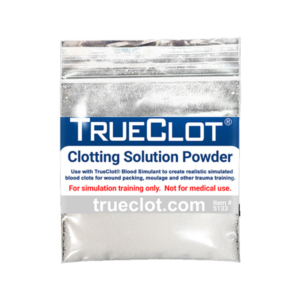 TrueClot® Clotting Solution is mixed with TrueClot Blood Simulant to instantly create realistic simulated blood clots or avulsed tissue for use in moulage, bleeding control, trauma or surgical training. It may also be applied to training gauze to cause simulated clotting when packed into flowing Blood Simulant during wound packing training.