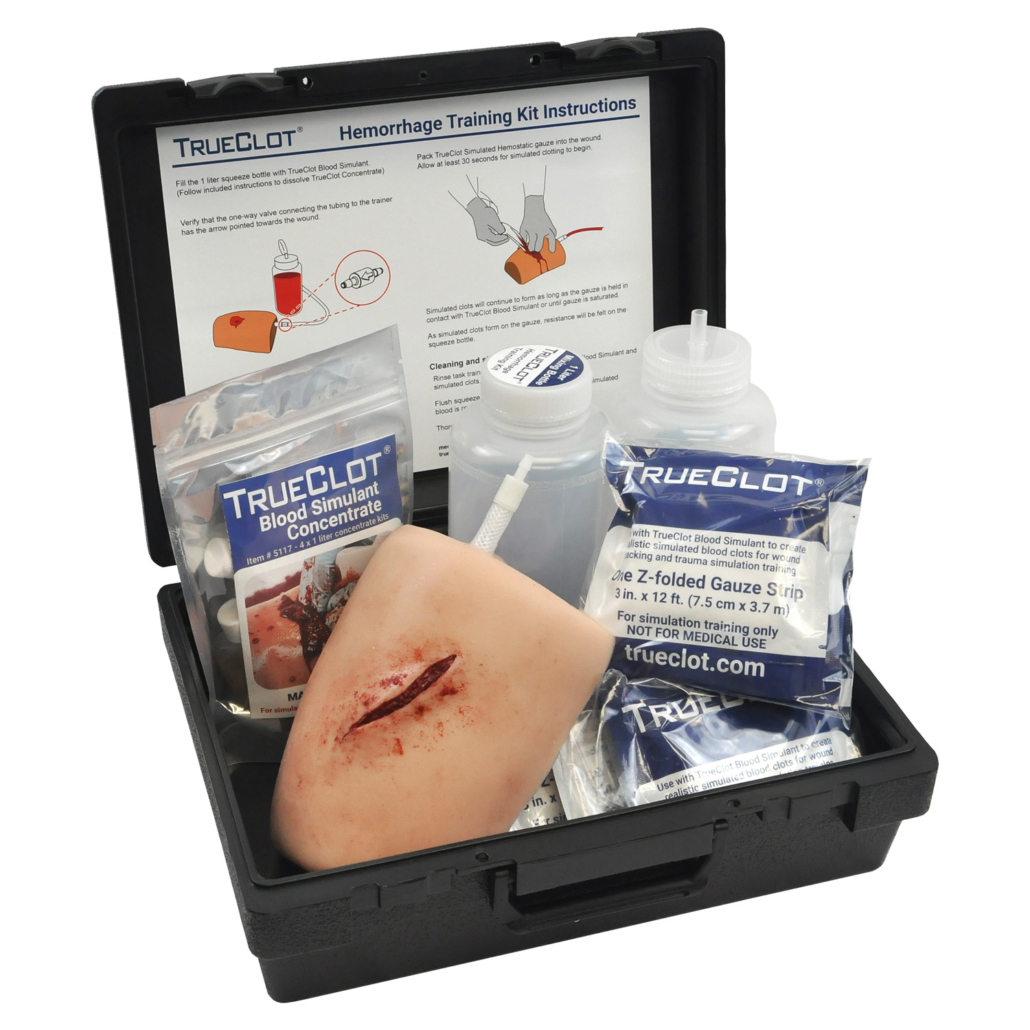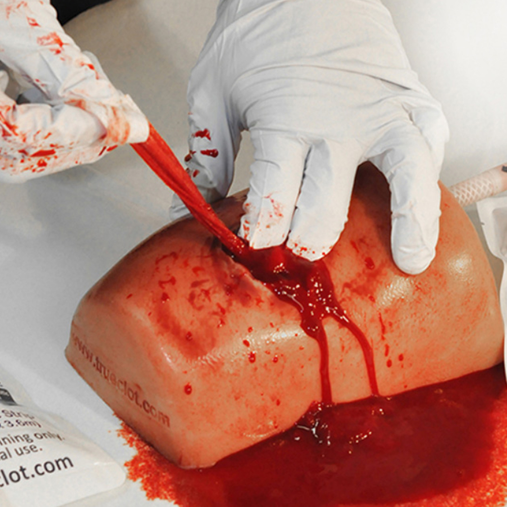 TrueClot® Hemorrhage Control Training Kits provide everything needed to simulate proper wound packing techniques using hemostatic gauze. The TrueClot® Wound Packing Task Trainers are realistic, durable and low-cost training props. When used together, TrueClot® Blood Simulant and Simulated Hemostatic Gauze will form realistic simulated blood clots.