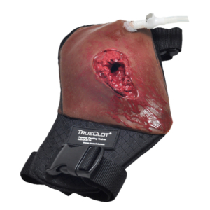 The TrueClot® Inguinal Packing Trainer is a wearable training aid that simulates a junctional hemorrhage that cannot be treated with a tourniquet. The trainer can be placed on a manikin or worn by an actor for a higher level of realism to teach advanced wound packing skills.