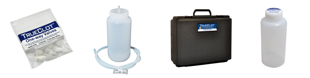 No two units or departments conduct trauma lanes, hemorrhage control skill stations or training scenarios exactly alike. Simulation training can often be as chaotic as the real thing. To accommodate as much creativity and customization as possible (and to replace the inevitable broken or lost part) we supply accessories ranging from mixing bottles and storage cases, to replacement valves and extra tubing. To fill any special need to complete or enhance your TrueClot® training experience, please contact trueclot@integratedmc.com or visit our Where to Purchase page.