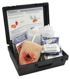 TrueClot® Hemorrhage Control Training Kits provide everything needed to simulate or demonstrate proper wound packing with hemostatic gauze. Each kit includes a TrueClot Wound Packing Task Trainer, 4 x 1 liter TrueClot Blood Simulant Concentrate packs, a 1 liter mixing bottle and 9 packs of 12ft. TrueClot Simulated Hemostatic Gauze all in a sturdy, protective carrying case with instructions for use mounted to the inside of the lid. Choices of laceration versus gunshot wound task trainer and rolled versus Z-folded gauze allow you to customize your training. The contents of the kit can typically be used to train approximately 20-30 people in the basics of wound packing and hemorrhage control. The extra mixing bottle allows you to have backup blood simulant available so you never have any delays in your busy training day. The kits enable realistic, portable and affordable wound packing simulation for TCCC, TECC, TEMS, PHTLS, active shooter and customized training.